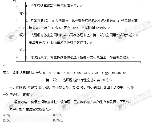 2010年1月黑龙江省普通高中学业水平考试(化学)