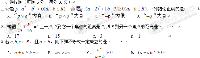 宁夏银川一中10-11学年高二上学期期末考试(数学理)缺答案