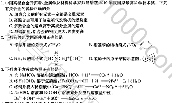 江苏省百校2011届高三学业质量分析考试(化学)扫描版