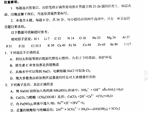 天津市和平区2011届高三一模考试(理综化学)(2011天津和平区一模)扫描版