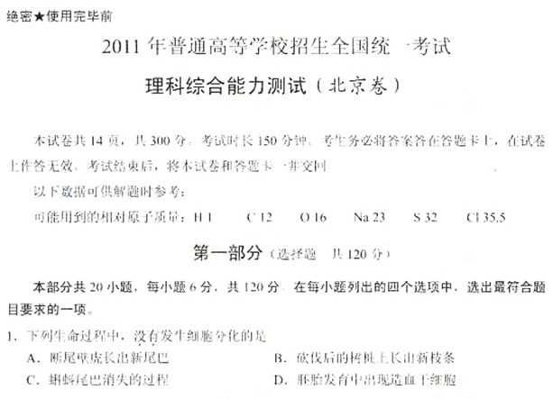 2011年普通高等学校招生全国统一考试(北京卷)(理综)扫描版有答案