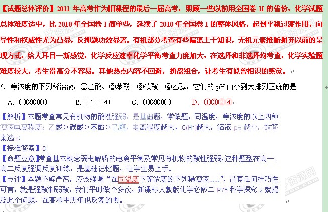2011年高考真题湖北A卷(暨全国卷)(理综化学)解析版二