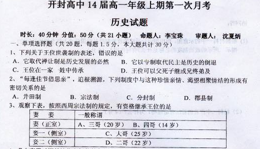 河南省开封高中2011-2012学年高一上学期第一次月考试题(历史)扫描版
