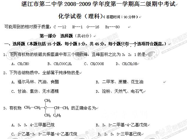 广东省湛江二中08-09学年高二下学期期中考试(化学理)