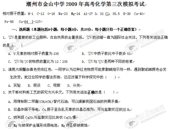 广东省潮州市金山中学2009届高三第三次模拟考试(化学)