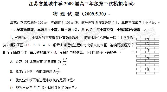 江苏省盐城中学2009届高三年级第三次模拟考试(物理)