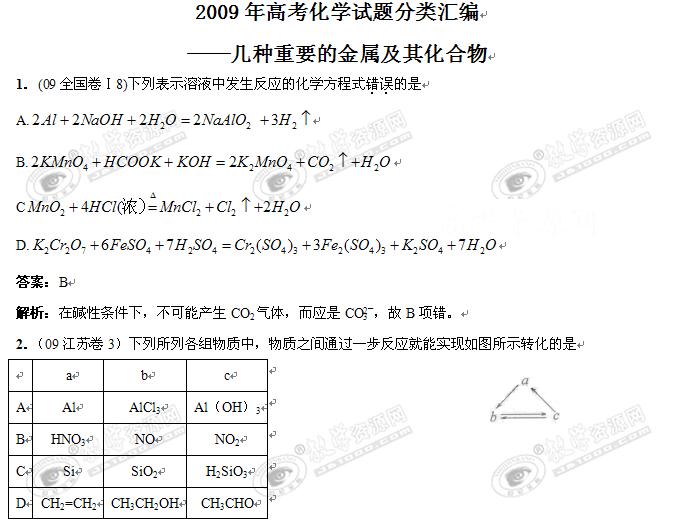 2009年全国高考化学试题分类汇编——几种重要的金属及其化合物