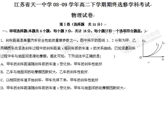 江苏省天一中学08-09学年高二下学期期终选修学科考试(物理)