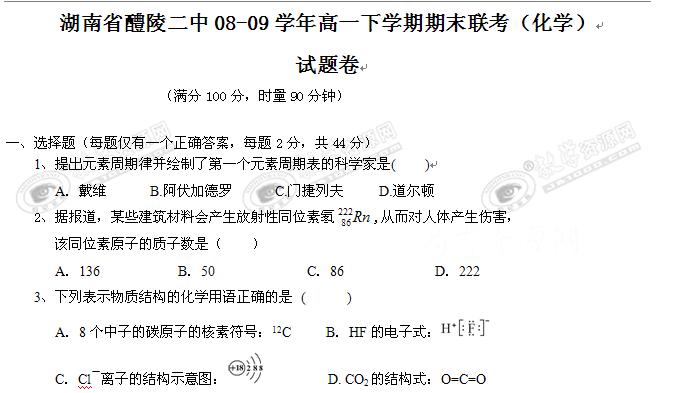 湖南省醴陵二中08-09学年高一下学期期末联考(化学)