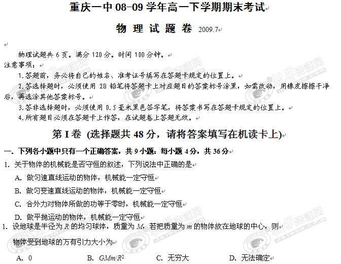 重庆一中08-09学年高一下学期期末考试(物理)无答案