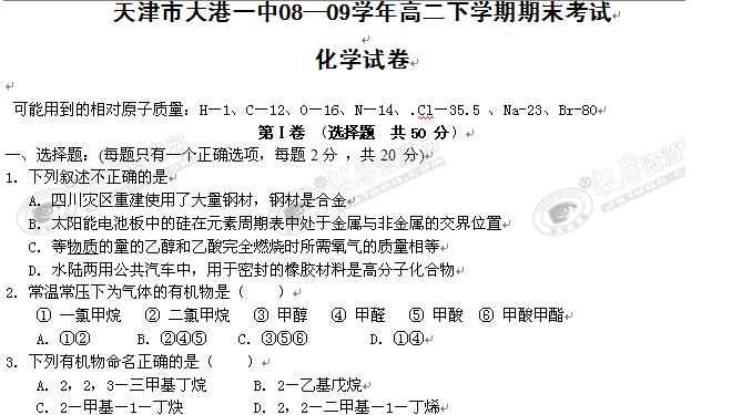 天津市大港一中08—09学年高二下学期期末考试(化学)