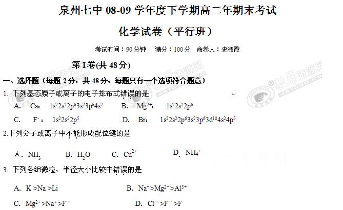 福建省泉州七中08-09学年高二下学期期末考试(化学)(平行班)