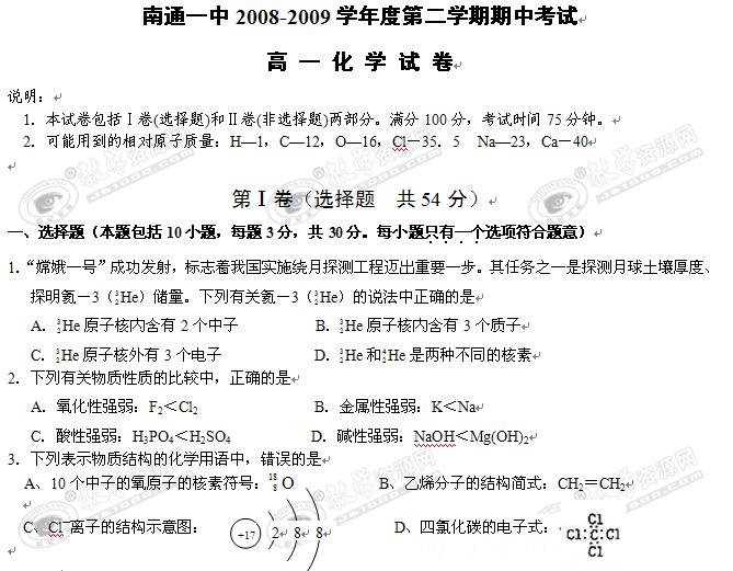 江苏省南通一中08-09学年高一下学期期中考试(化学)
