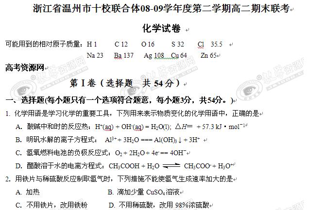 浙江省温州市十校联合体08-09学年度第二学期高二期末联考(化学)