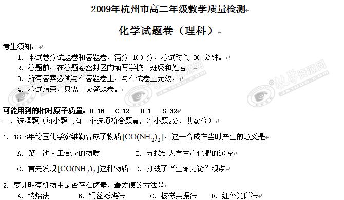 浙江省杭州市08-09学年高二下学期期末考试(化学)