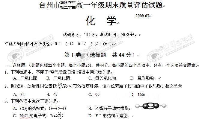 浙江省台州市08-09学年高一下学期期末考试(化学)