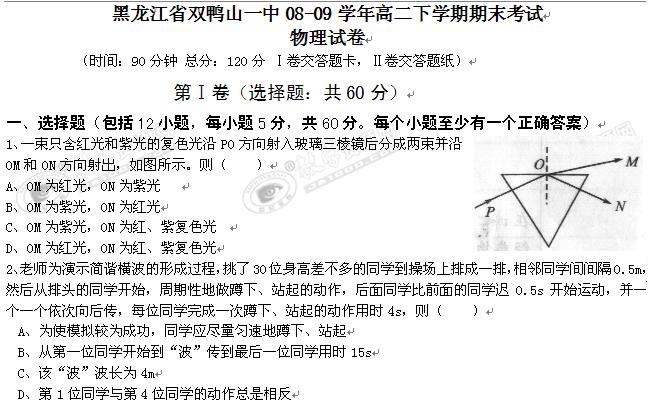 黑龙江省双鸭山一中08-09学年高二下学期期末考试(物理)