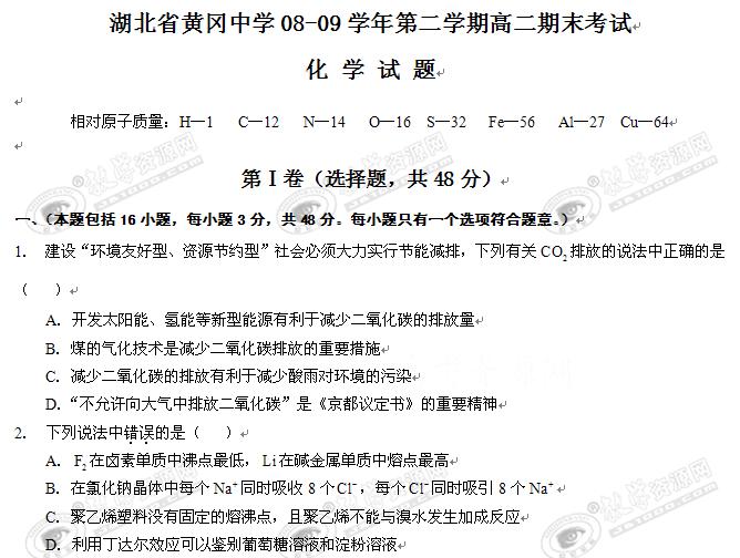 湖北省黄冈中学08-09学年高二下学期期末考试(化学)