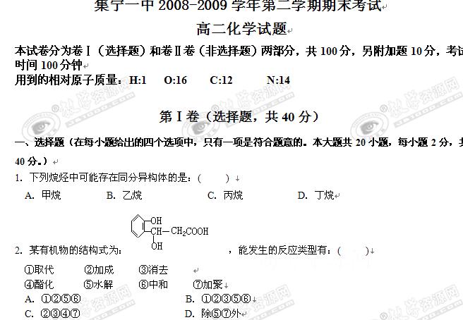 内蒙古集宁一中08-09学年高二下学期期末考试(化学)