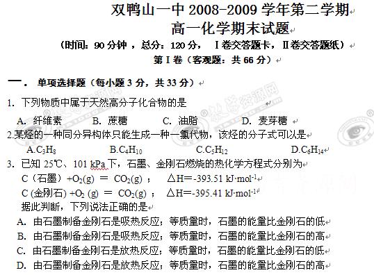 黑龙江省双鸭山一中08-09学年高一下学期期末考试(化学)
