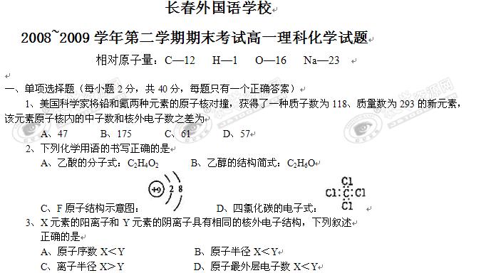 吉林省长春外国语学校08-09学年高一下学期期末考试(化学理)