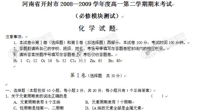 河南省开封市08-09学年高一下学期期末考试(化学)