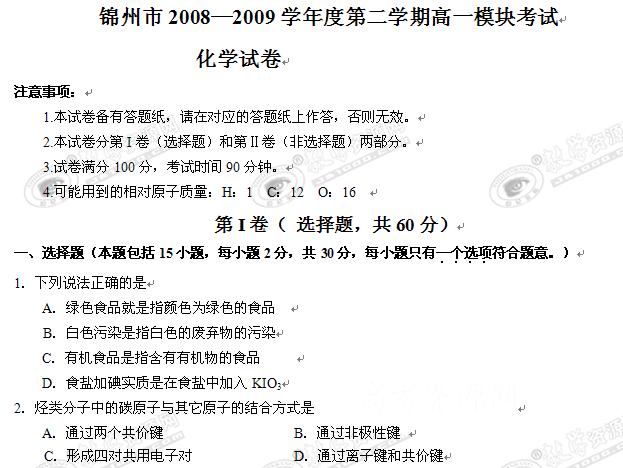 辽宁省锦州市08-09学年高一下学期期末考试(化学)