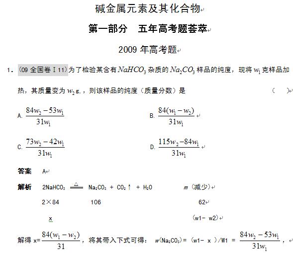 化学:五年高考三年联考精品题库——《碱金属元素及其化合物》