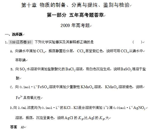 化学:五年高考三年联考精品题库——《物质的制备、分离与提纯、鉴别与检验》