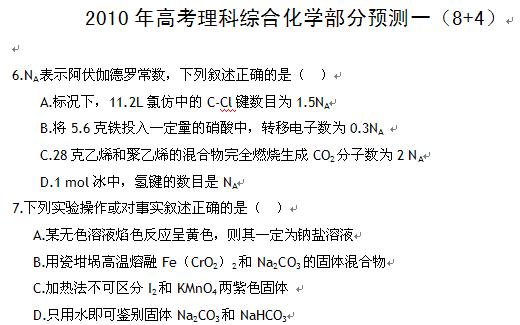 2010届高考理科综合化学部分预测(一)