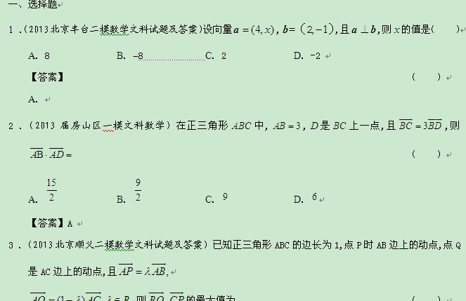 北京市2013届高三最新文科数学模拟试题分类汇编4:平面向量