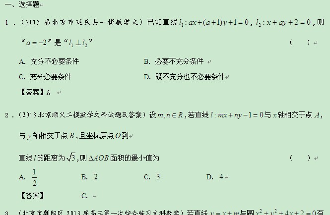 北京市2013届高三最新文科数学模拟试题分类汇编8:直线与圆