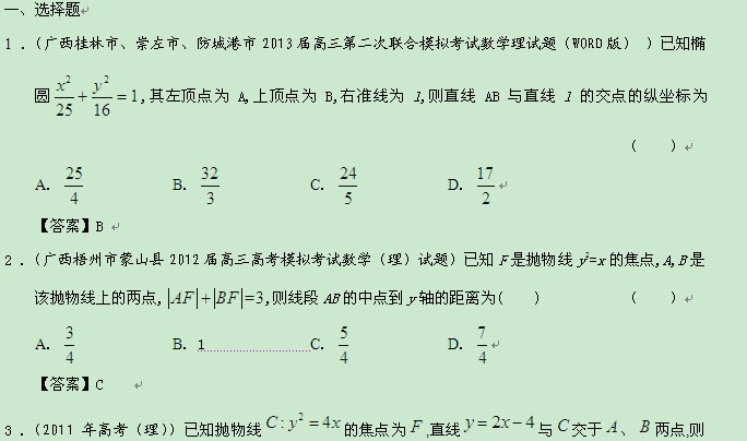 广西2013届高三理科(数学)精选(6年高考(大纲版)+2年模拟)分类汇编9:圆锥曲线(2)