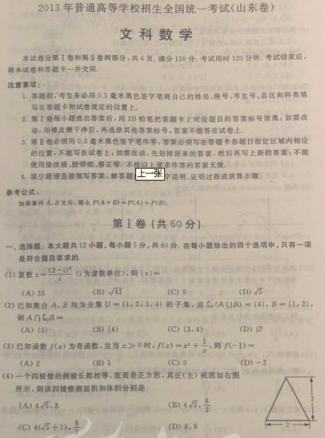 2013年普通高等学校招生全国统一考试山东卷(数学文)扫描版含答案