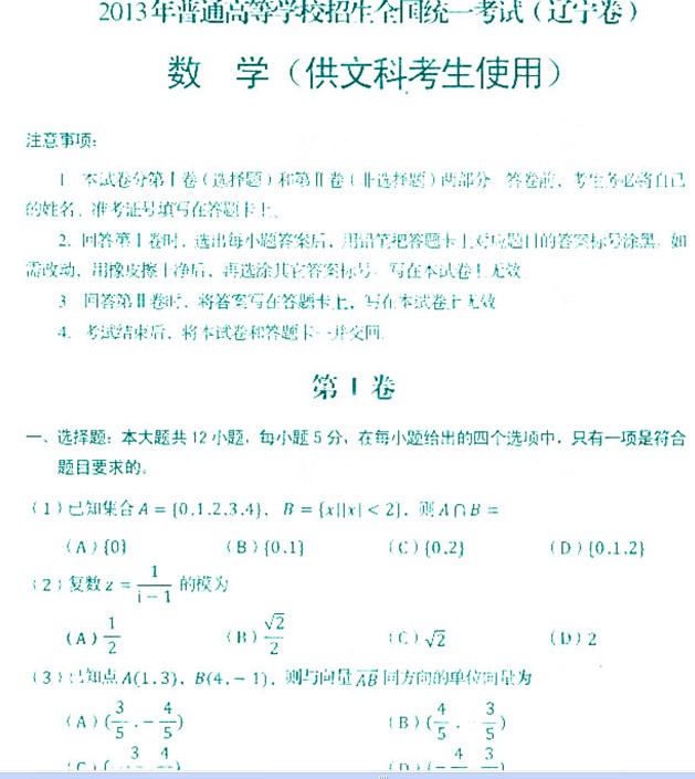 2013年普通高等学校招生全国统一考试辽宁卷(数学文)扫描版含答案