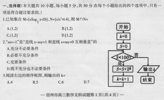 安徽省宿州市2014届高三第一次教学质量检测(数学文)清晰扫描版