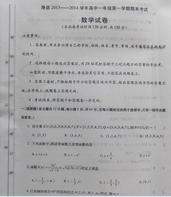 河南省滑县2013-2014学年高一上学期期末考试(数学)扫描版