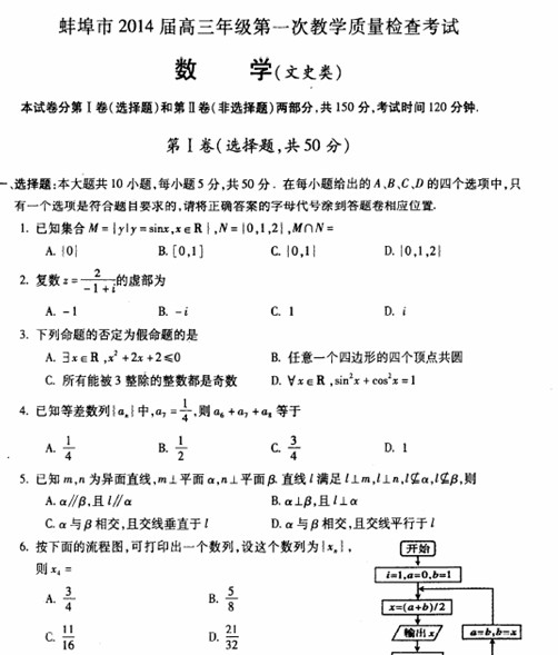 安徽省蚌埠市2014届高三第一次质量检测(数学文)扫描版