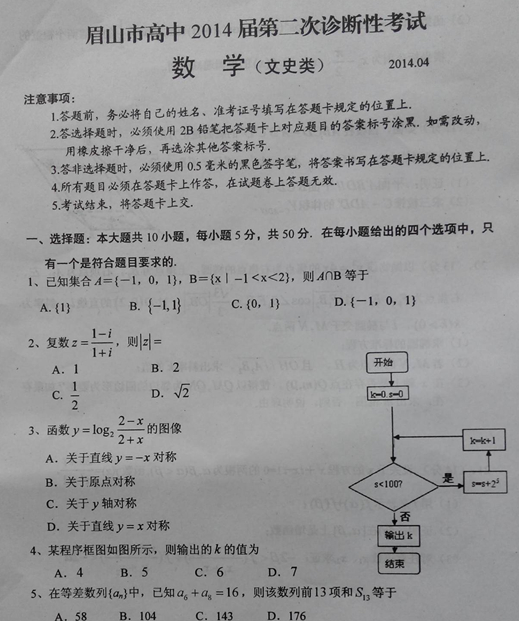 四川省眉山市2014届高三第二次诊断性考试(数学文)(2014眉山二诊) 扫描版