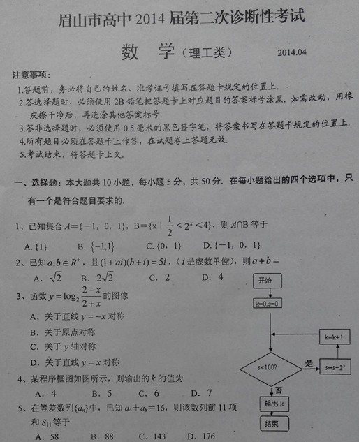 四川省眉山市2014届高三第二次诊断性考试(数学理)(2014眉山二诊) 扫描版