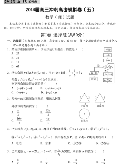 【江淮名校·系列卷】安徽省2014届高三冲刺高考模拟(数学理)(五) 扫描版