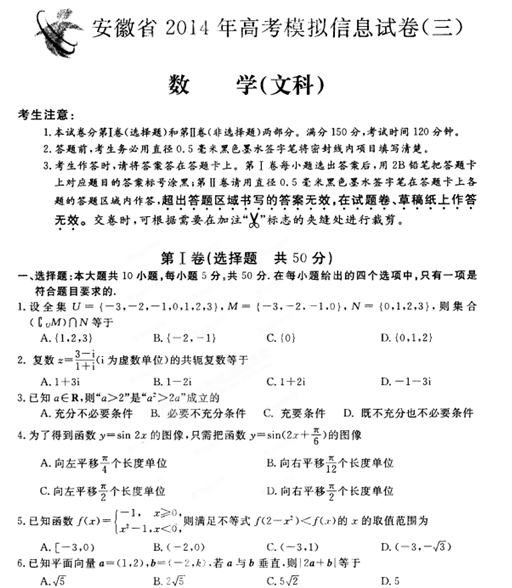 安徽省2014届高考模拟信息考试(数学文)(三) 扫描版