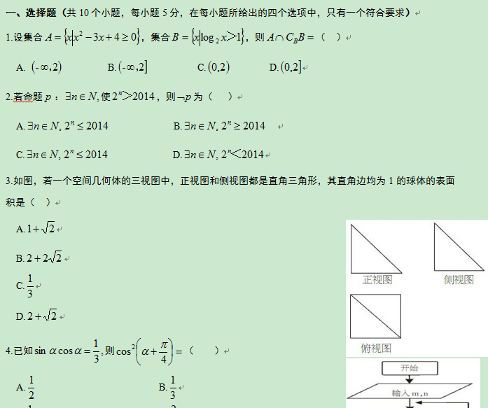 四川省凉山州2014届高三第二次诊断性测试(数学文)