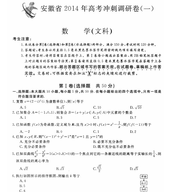 安徽省2014届高三高考冲刺调研卷数学(文)试题(一) 扫描版