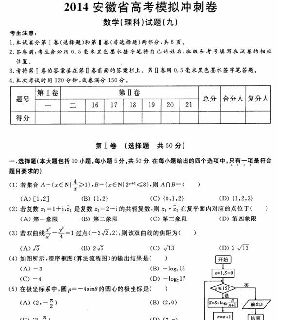 安徽省考试研究中心2014届高考模拟冲刺(九) (数学理) 扫描版