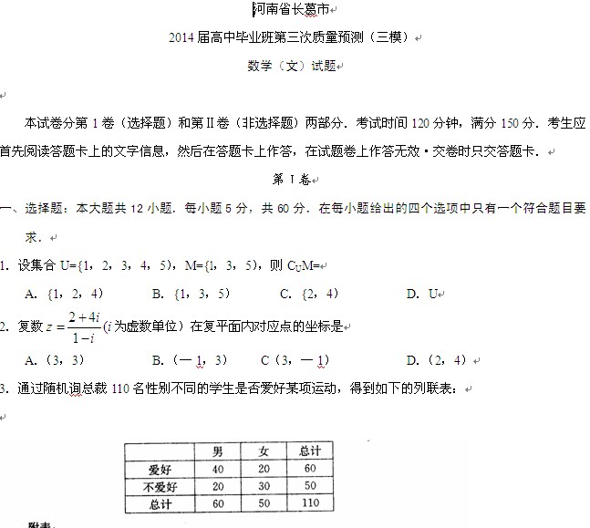河南省郑州市2014届高三第三次质量预测(数学文)