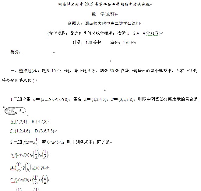 湖南师大附中2013-2014学年高二下学期期中考试(数学文)Word版含解析