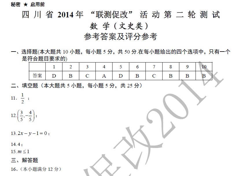 四川省2014年“联测促改”活动第二轮测试 数学文(仅参考答案)PDF版