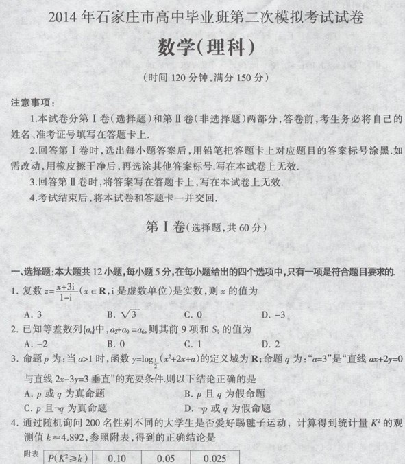 【2014石家庄市二模】河北省石家庄市2014届高三第二次模拟考试 (数学理)扫描版