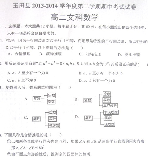 河北省玉田县2013-2014学年高二下学期期中考试(数学文)扫描版